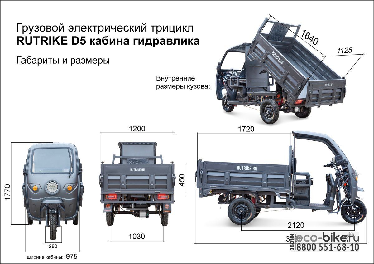 Электрический трицикл Rutrike D5 с кабиной и гидроподъёмником кузова — новинка от Rutrike